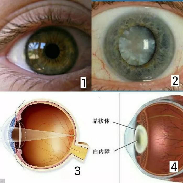 图1:正常晶状体 图2:白内障,图3:正常晶状体矢状位示意图,图4:白内障矢状位示意图