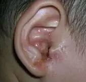 其次,以外耳湿疹较为多见。它是发生于外耳的变态反应性多形性皮炎。目前病因及发病机制尚不清楚,认为可能与过敏源、精神内分泌因素相关。本病急性期耳痒剧烈,可伴有淡黄色水样分泌物,若未及时治疗,局部皮肤可出现结痂、脱屑,慢性患者局部皮肤可增厚。本病需要抗过敏治疗,必要时可局部给予抗生素、激素。