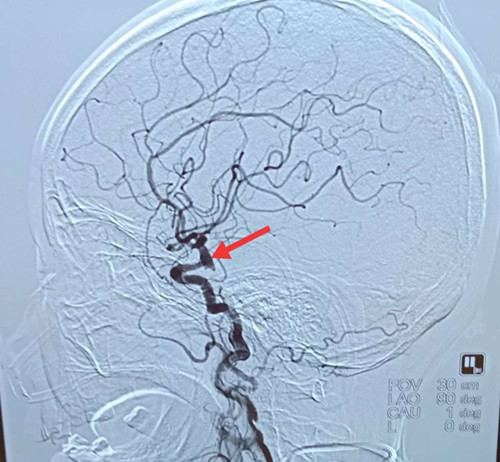 事情还得从2019年2月8日大年初四说起。刘大娘,72岁,因晨起引炉火时被呛,出现剧烈咳嗽,伴喷射状呕吐,呕吐物为胃内容物。家属立即将她送至卢龙县医院进行诊治,7点行头颅CT,结果显示蛛网膜下腔出血,可疑颅内动脉瘤破裂出血,因当地无法提供进一步诊治,家属辗转了解到秦皇岛军工医院可以进行全脑动脉造影术及相关介入治疗,于是驱车两个多小时,来到我院神经外科。医生给予紧急检查,于10点30分在介入中心行全脑动脉造影术。12点造影结束,结果显示左侧颈内动脉后交通段多形性动脉瘤。