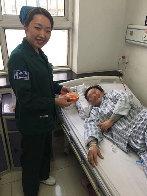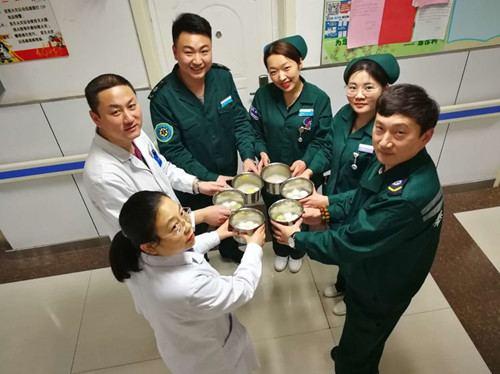 病人因病不能回家,急诊科医护人员在食堂员工的帮助下煮好热腾腾的元宵送到病床前,并祝他们早日康复。病人连声致谢。