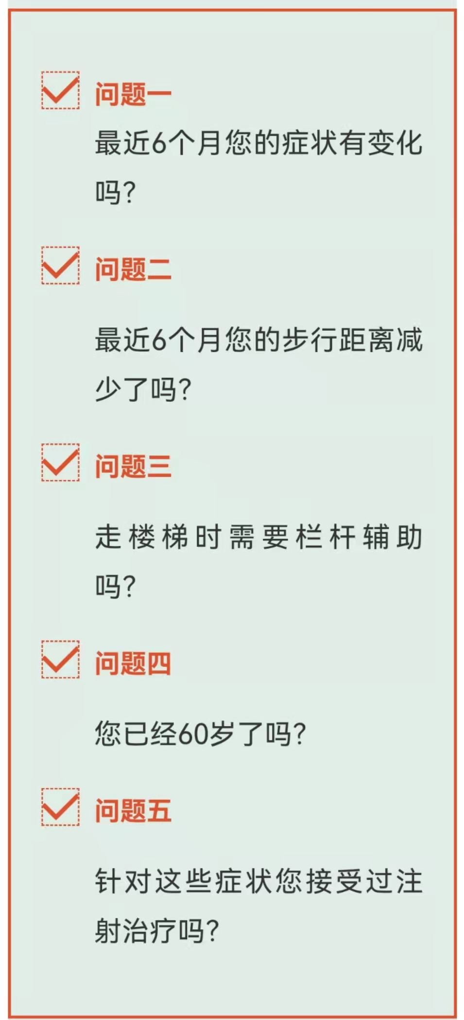 目前骨关节炎是一种大病、慢病、严重性疾病,是一类临床需求未得到满足的疾病,是造成残疾的重要原因,且疾病经济负担较重。如下5个问题中若有≥3个问题回答“是”,建议到风湿免疫科就诊,做到早发现、早诊断、早治疗,从而缓解疼痛,恢复关节功能,提高生活质量。