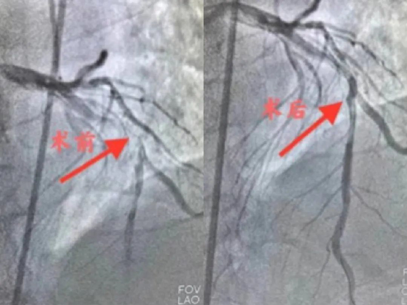 在心血管内二科于红波主任的指导下,在场医护争分夺秒开始抢救,胸外按压、电除颤等,大家迅速、沉稳、有序的密切配合着。经过20分钟高效救治,患者终于恢复窦性心律,生命体征逐渐平稳,送至介入中心继续治疗。医生为患者行冠脉造影显示前降支中段可见99%偏心狭窄,D1口部60%狭窄,回旋支中段可见99%狭窄,右冠状动脉中段可见70%偏心狭窄,远段可见50%偏心狭窄,于前降支植入支架1枚。