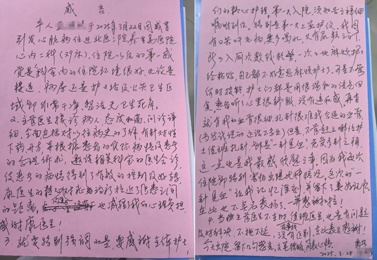 近日,心血管内二科护理站收到一封29床阿姨送来的“出院感言”,信中真挚的语言深深地表达了对医护人员精心治疗和暖心服务的感激之情。一句“感谢”是对医护人员专业素养与人文关怀的高度认可,同时也是激励医务工作者不断前进的动力。