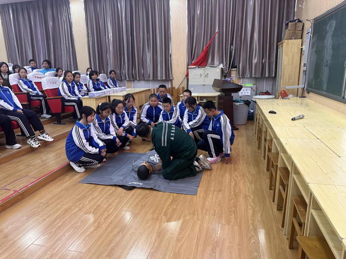 在讲解过程中,医务人员不时与同学们互动,邀请同学们上台进行实际操作演练。同学们热情高涨,积极参与,在医务人员的指导下,认真练习每一个动作,力求掌握正确的急救技能。