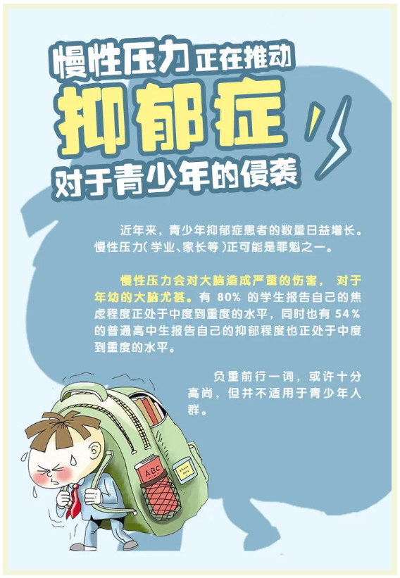 青少年是抑郁症的发病对象,多由学习压力太大造成。青少年的发病率很高,其症状多种多样,表现复杂。