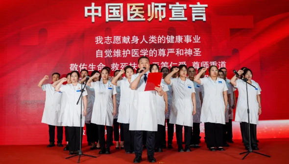大会举行了庄严的医师宣誓仪式。在副院长谭强的领誓下,青年医生、十佳医师们身着洁白工作服,右手握拳,举过肩头,铿锵有力地宣读医者誓言,彰显了“健康所系,性命相托”的坚定信念,表达了全体医师对医学事业的忠诚与为患者服务的决心。